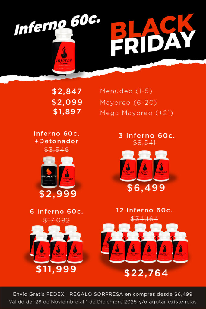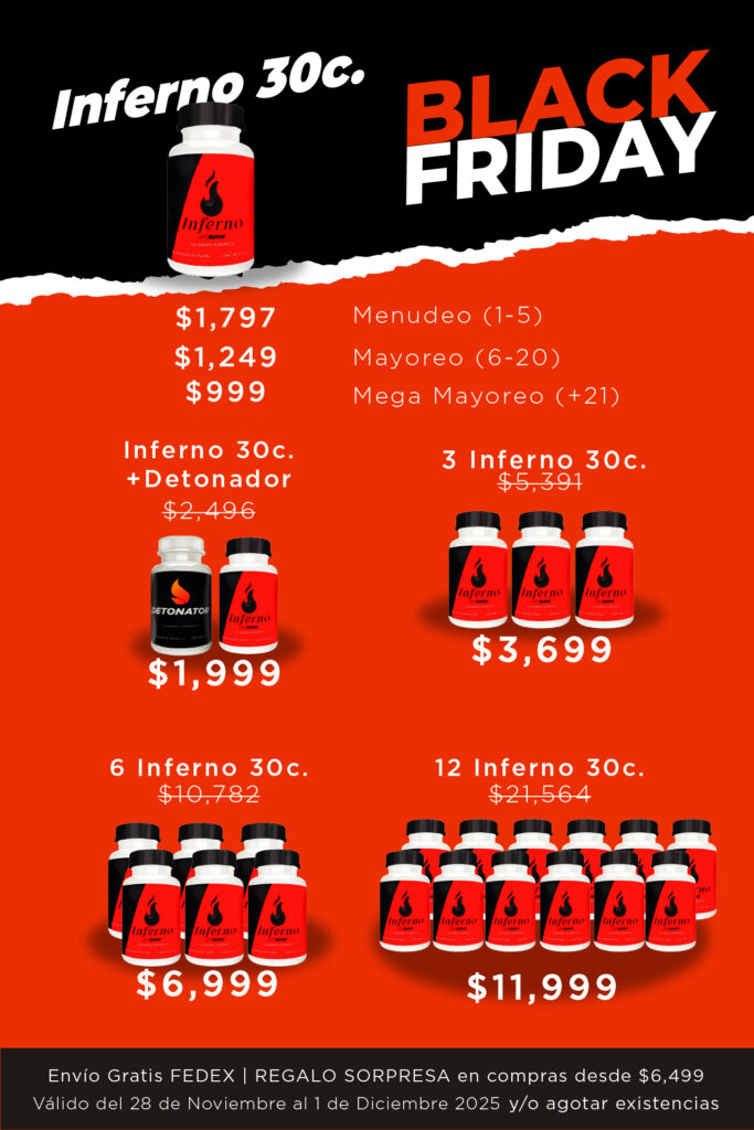 Con Inferno, tu compra se convierte en una sorpresa: al adquirir productos por 6,499 pesos o más, recibirás un obsequio especial sin costo adicional. Además, el envío es completamente gratis a través de Federal Express. ¡Deja que Inferno te sorprenda y aprovecha esta oportunidad calurosa